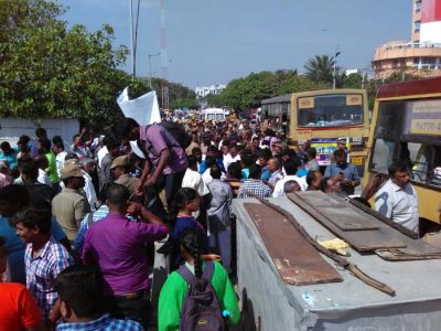 மீனவர்கள் நொச்சிக் குப்பம் பகுதியில் இருந்து வெளியே சாலைக்கு அருகில் கூட பேரணியாகச் செல்ல முடியாதவாறு அவர்களது குடியிருப்புப் பகுதிக்கு அருகிலேயே அவர்களை மடக்கி கைது வாகனங்களில் ஏற்றியது போலீசு. இப்படி ஒரு போராட்டம் நடக்கிறது, இப்படி ஒரு பிரச்சினை இருக்கிறது என்பது மக்களில் யாருக்கும் தெரிந்து விடக் கூடாது என்ற முன்னெச்சரிக்கையோடு போராட்டத்தை முடக்க முயற்சித்தது போலீசு.