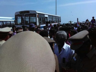 அங்கு வந்த போலீசு அவர்களை அங்கிருந்து கலைந்து செல்லுமாறு மிரட்டியது. மீனவர்கள் தங்களது கோரிக்கையை வலியுறுத்தி ஜனநாயக முறைப்படி போராட அனுமதிக்குமாறு கேட்டனர். பொதுமக்களுக்கு பிரச்சினை ஏற்படும் என்று கூறி பேரணிக்கு அனுமதிக்க முடியாது என்று கூறியது போலீசு.