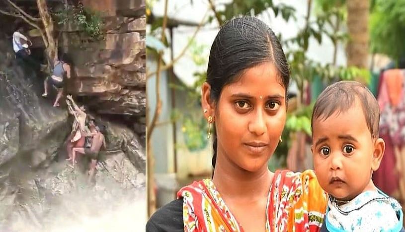 காட்டாற்று வெள்ளம் பெருக்கெடுத்து ஓட, பெரும் பாறைகள் கொண்ட இடத்தில் சிக்கிக்கொண்ட அந்த தாயையும் குழந்தையையும் மீட்க இளைஞர்கள் சிலர் முயற்சி செய்தனர்.
